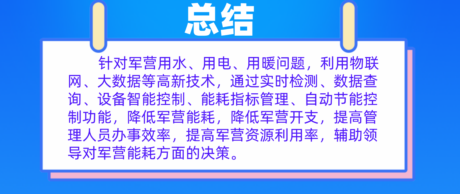 針對軍營用水、用電、用暖問題,利用物聯網、大數據等高新技術,通過實時檢測、數據查詢、設備智能控制、能耗指標管理、自動節能控制功能,降低軍營能耗,降低軍營開支,提高管理人員辦事效率,提高軍營資源利用率,輔助領導對軍營能耗方面的決策。