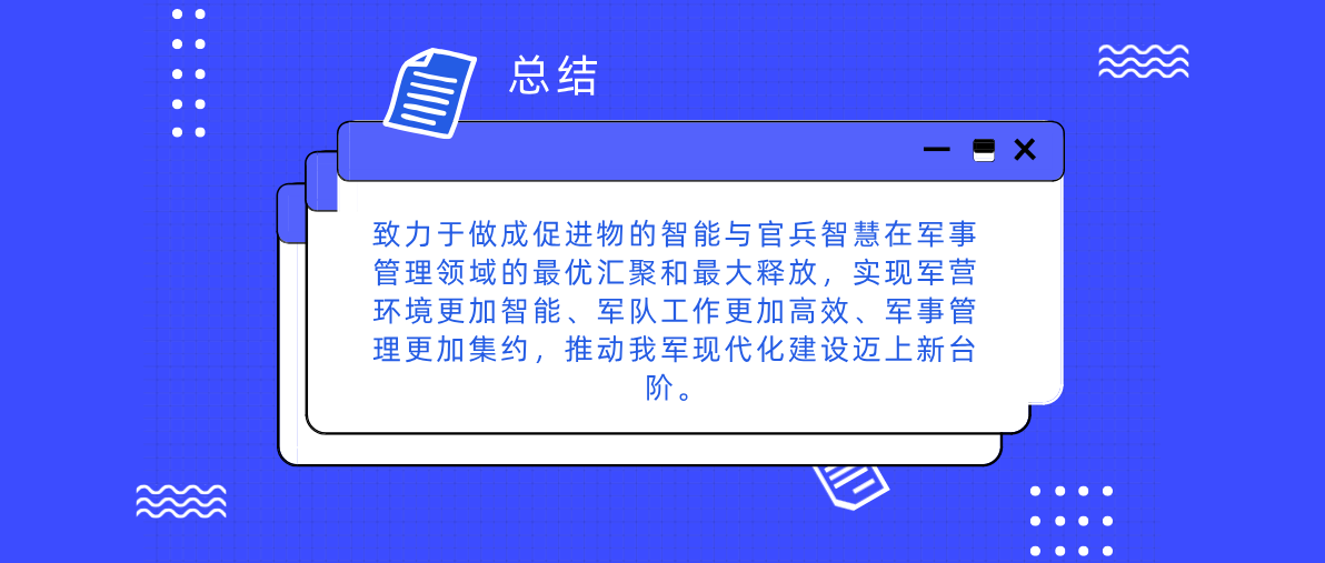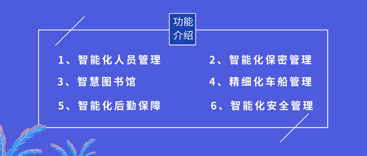 深耕智慧營區建設,專注智慧軍營系統開發。致力于做成促進物的智能與官兵智慧在軍事管理領域的匯聚和釋放,實現軍營環境更加智能、營院工作更加高效、管理更加集約,推動我軍現代化建設邁上新臺階。
