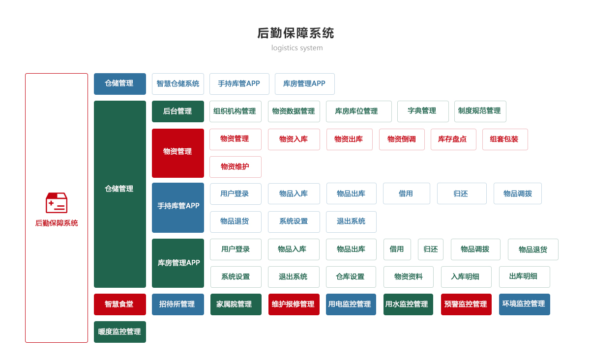 通過集成倉儲管理、營房管理、居住保障、監(jiān)控管理、環(huán)境監(jiān)測等功能,實現(xiàn)后勤保障的高效、智能管理。該系統(tǒng)具有全面性、智能化、移動化、個性化、高效性和安全性等特點,是實現(xiàn)全面后勤管理的理想選擇。