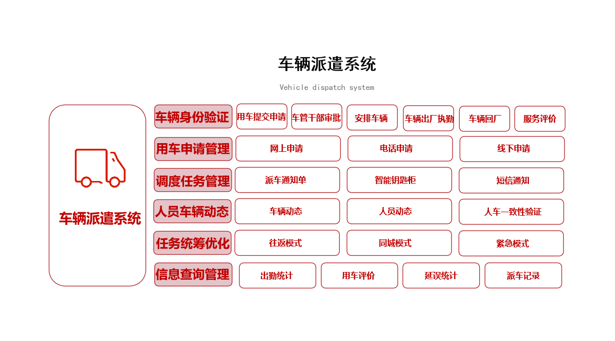 車輛派遣系統(tǒng),實(shí)現(xiàn)用車身份智能核驗(yàn)、派遣任務(wù)智能調(diào)度、人員車輛動(dòng)態(tài)實(shí)時(shí)跟蹤、出車記錄實(shí)時(shí)查詢功能,做到軍車派遣自動(dòng)化控制管理,精細(xì)化運(yùn)營(yíng)。 主要應(yīng)用于部隊(duì)公務(wù)用車管理,通過規(guī)范化的過程管理機(jī)制,與智能化設(shè)備相結(jié)合,實(shí)現(xiàn)線上申請(qǐng)、車場(chǎng)調(diào)度、線下管理三位一體的車輛信息化管理新模式。 系統(tǒng)以勤務(wù)汽車隊(duì)為主體,以各級(jí)保障單位為服務(wù)對(duì)象,以搭建用車人和駕駛員之間的橋梁為目標(biāo),在規(guī)范化用車、標(biāo)準(zhǔn)化服務(wù)、精細(xì)化管理方面,提供服務(wù)保障,讓車輛管理做到“足不出戶,一切盡在掌握”。