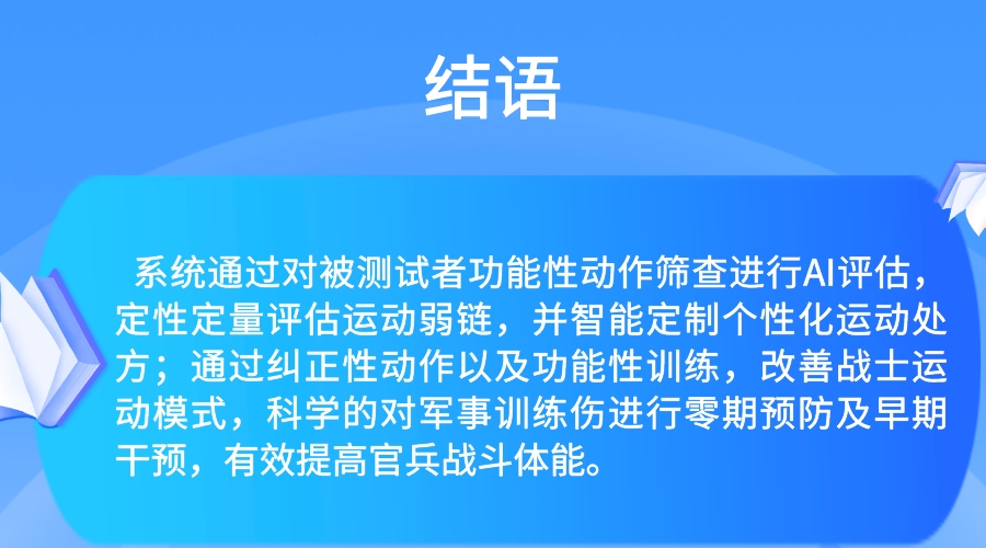 系統通過對被測試者功能性動作篩查進行AI評估,定性定量評估運動弱鏈,并智能定制個性化運動處方;通過糾正性動作以及功能性訓練,改善戰士運動模式,科學的對軍事訓練傷進行早期預防及干預,有效提高官兵戰斗體能。