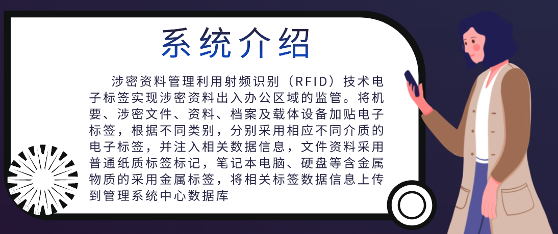 涉密資料管理利用射頻識別(RFID)技術電子標簽實現涉密資料出入辦公區域的監管。將機要、涉密文件、資料、檔案及載體設備加貼電子標簽,根據不同類別,分別采用相應不同介質的電子標簽,并注入相關數據信息,文件資料采用普通紙質標簽標記,筆記本電腦、硬盤等含金屬物質的采用金屬標簽,將相關標簽數據信息上傳到管理系統中心數據庫,同時辦公樓加裝門禁控制應用,涉密資料或設備經系統登記、審核后方可帶離辦公區域。否則,未經審核涉密資料或設備擅自帶出辦公樓時,門禁自動報警至值班監控中心處理。