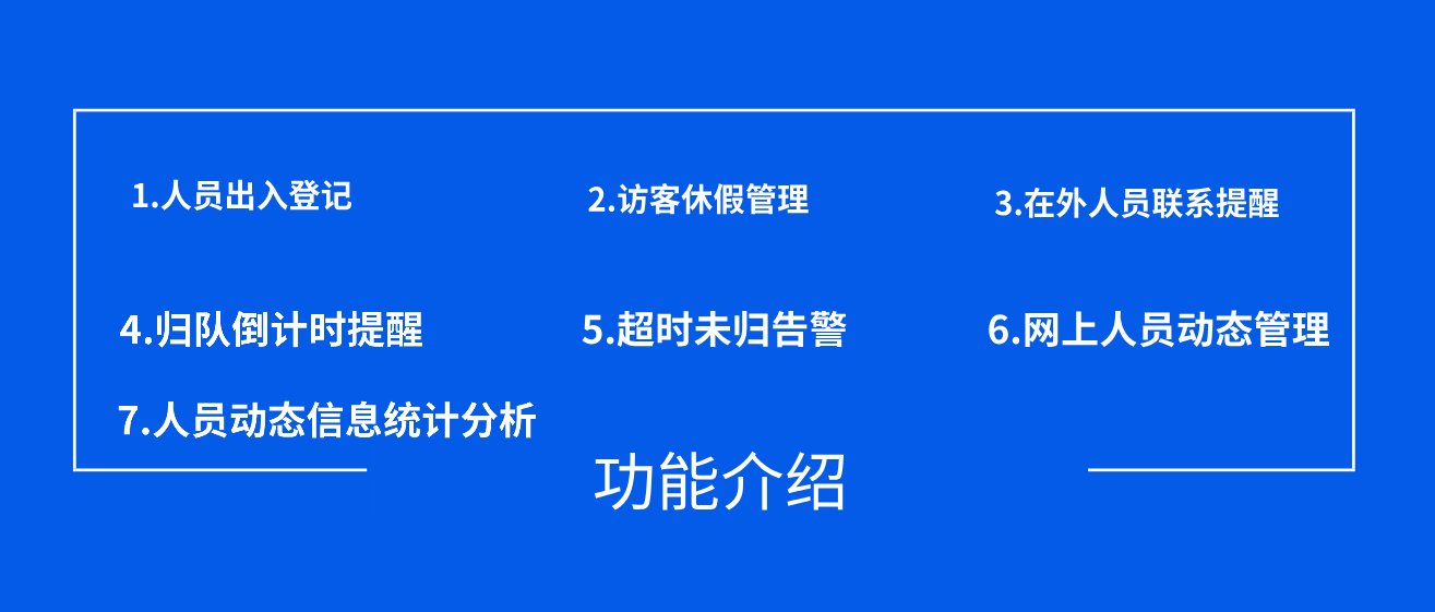 系統可實現人員動態信息分布一覽,實時查看人員在位情況和具體的數量分布情況,統計出人員在位率、各類在外人員的數量比例,查詢人員的在外歷史記錄、在外次數及在外時長、聯系記錄、未外出人員等 信息,并可輸出至 Excel 文檔中進行二次編輯。 除以上基本功能外,系統還具有制定人員外出計劃、標記事務消息、人員生日提醒、批量登記人員出入、自動銷假、設定出入管理制度、導 出人員分布一覽表等功能。