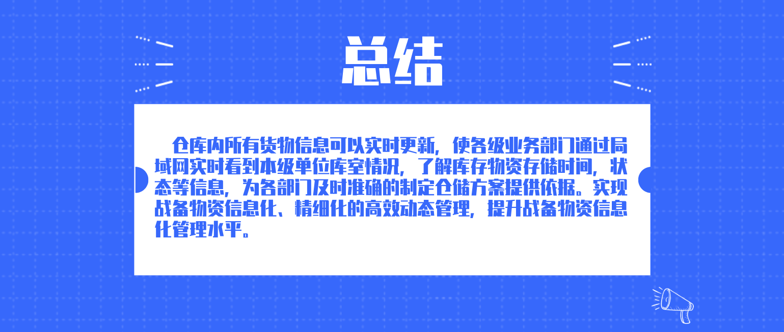 倉庫內所有貨物信息可以實時更新,使各級業務部門通過局域網實時看到本級單位庫室情況,了解庫存物資存儲時間,狀態等信息,為各部門及時準確的制定倉儲方案提供依據。實現戰備物資信息化、精細化的高效動態管理,提升戰備物資信息化管理水平。