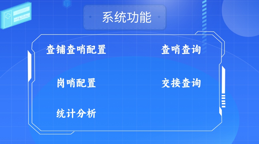 智慧軍營崗哨管理系統開發:查鋪查哨配置、查哨查詢、崗哨配置、交接查詢、統計分析功能。
