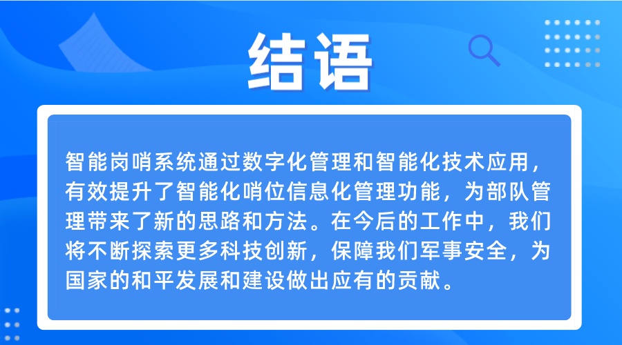 智慧軍營智能崗哨系統通過數字化管理和智能化技術應用,有效提升了智能化哨位信息化管理功能,為部隊管理帶來了新的思路和方法。在今后的工作中,我們將不斷探索更多科技創新,保障我們軍事安全,為國家的和平發展和建設做出應有的貢獻。