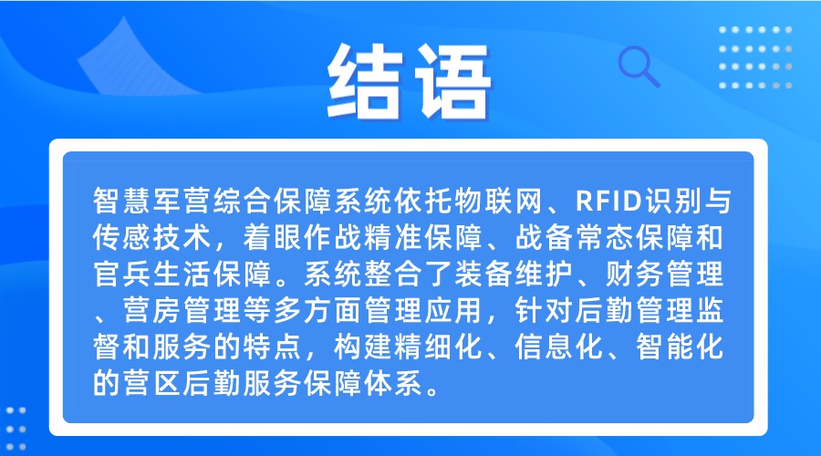 智慧軍營綜合保障系統依托物聯網、RFID識別與傳感技術,著眼作戰精準保障、戰備常態保障和官兵生活保障。系統整合了裝備維護、財務管理、營房管理等多方面管理應用,針對后勤管理監督和服務的特點,構建精細化、信息化、智能化的營區后勤服務保障體系。