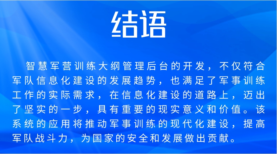 智慧軍營訓練大綱管理后臺的開發,不僅符合軍隊信息化建設的發展趨勢,也滿足了軍事訓練工作的實際需求,在信息化建設的道路上,邁出了堅實的一步,具有重要的現實意義和價值。該系統的應用將推動軍事訓練的現代化建設,提高軍隊戰斗力,為國家的安全和發展做出貢獻。