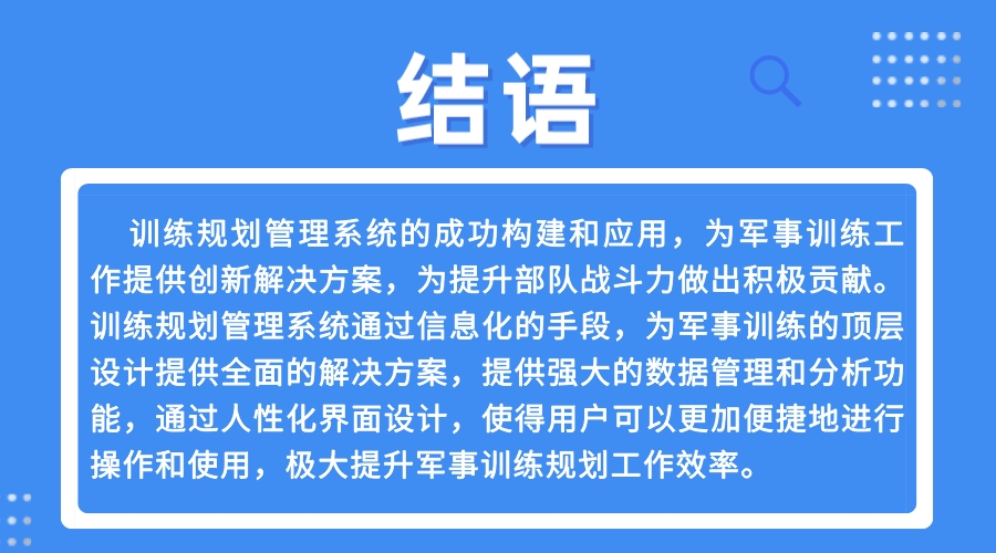 訓練規劃管理系統的成功構建和應用,為軍事訓練工作提供創新解決方案,為提升部隊戰斗力做出積極貢獻。訓練規劃管理系統通過信息化的手段,為軍事訓練的頂層設計提供全面的解決方案,提供強大的數據管理和分析功能,通過人性化界面設計,使得用戶可以更加便捷地進行操作和使用,極大提升軍事訓練規劃工作效率。