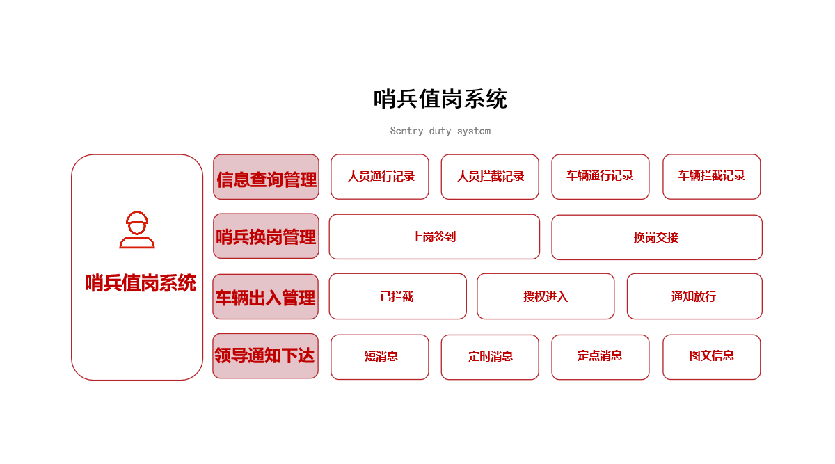 哨兵值崗系統(tǒng)是專為營(yíng)門哨兵設(shè)計(jì)的執(zhí)勤輔助系統(tǒng),利用智能化身份識(shí)別手段,審查人員及車輛的通行授權(quán)狀態(tài),有效提高哨兵的執(zhí)勤效率,以及營(yíng)院的安全管理水平。哨兵值崗系統(tǒng)解決哨兵難管理、人員車輛進(jìn)出管理難等矛盾,不僅對(duì)營(yíng)區(qū)內(nèi)哨崗人員配置、以及值班記錄等信息可以快速查詢,也可以讓人員到崗和人員交接通過(guò)網(wǎng)上辦公解決。使哨兵由過(guò)去的被動(dòng)、單一接收信息,轉(zhuǎn)變?yōu)槿缃裰鲃?dòng)、全維感知信息,有效助力組勤執(zhí)勤模式轉(zhuǎn)變;使執(zhí)勤管理完成了從難到易、從繁到簡(jiǎn)的重大轉(zhuǎn)變。