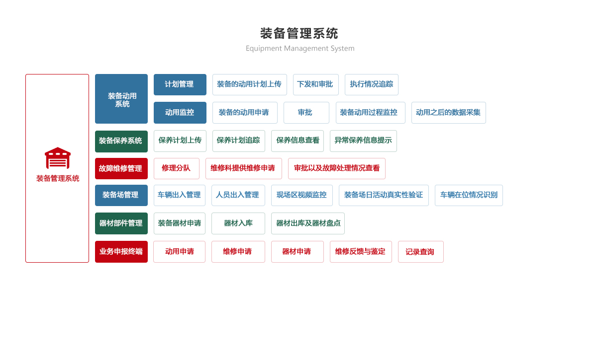 通過數字化手段,對裝備使用、維護、申報等全生命周期進行高效管理,提高裝備使用效率,降低維護成本,優化資源配置,助力部隊裝備管理工作穩步運行。利用系統的裝備場管理功能,及時掌握車輛當前所在位置,保障戰備物資的安全及裝備使用效率。