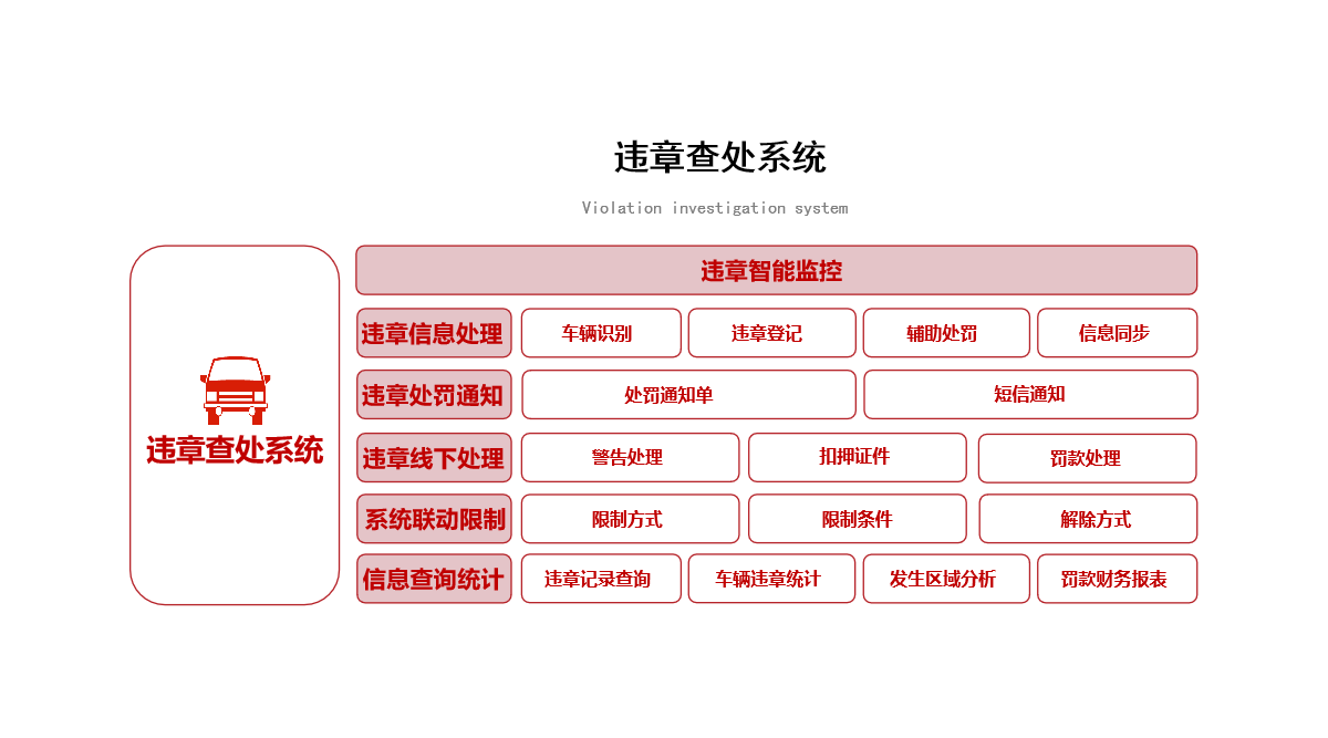 系統(tǒng)支持違章記錄查詢、車輛違章統(tǒng)計、發(fā)生區(qū)域分析和罰款財務(wù)報操作