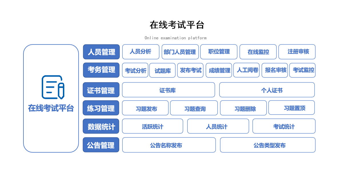 該模塊主要功能有考試分析、試題庫、試卷庫、發布考試、成績管理、人工閱卷、報名審核、考試監控等功能